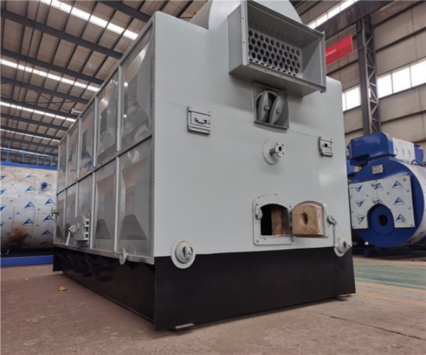 DZH快装活动炉排生物质锅炉是一种卧式三回程水火管式锅炉。锅炉的燃料是农林废物作为原材料,经过粉碎、混合、挤压、烘干等工艺,制成各种成型(如块状、颗粒状等)的,可直接燃烧的一种新型清洁燃料生物质燃料。燃料由输料机送入炉顶料仓,然后由螺旋给料机送入炉膛,均匀散落在炉排上,在此处由于高温烟气和一次风的作用逐步预热,干燥、着火、燃烧,此过程中析出大量挥发分,燃烧剧烈。